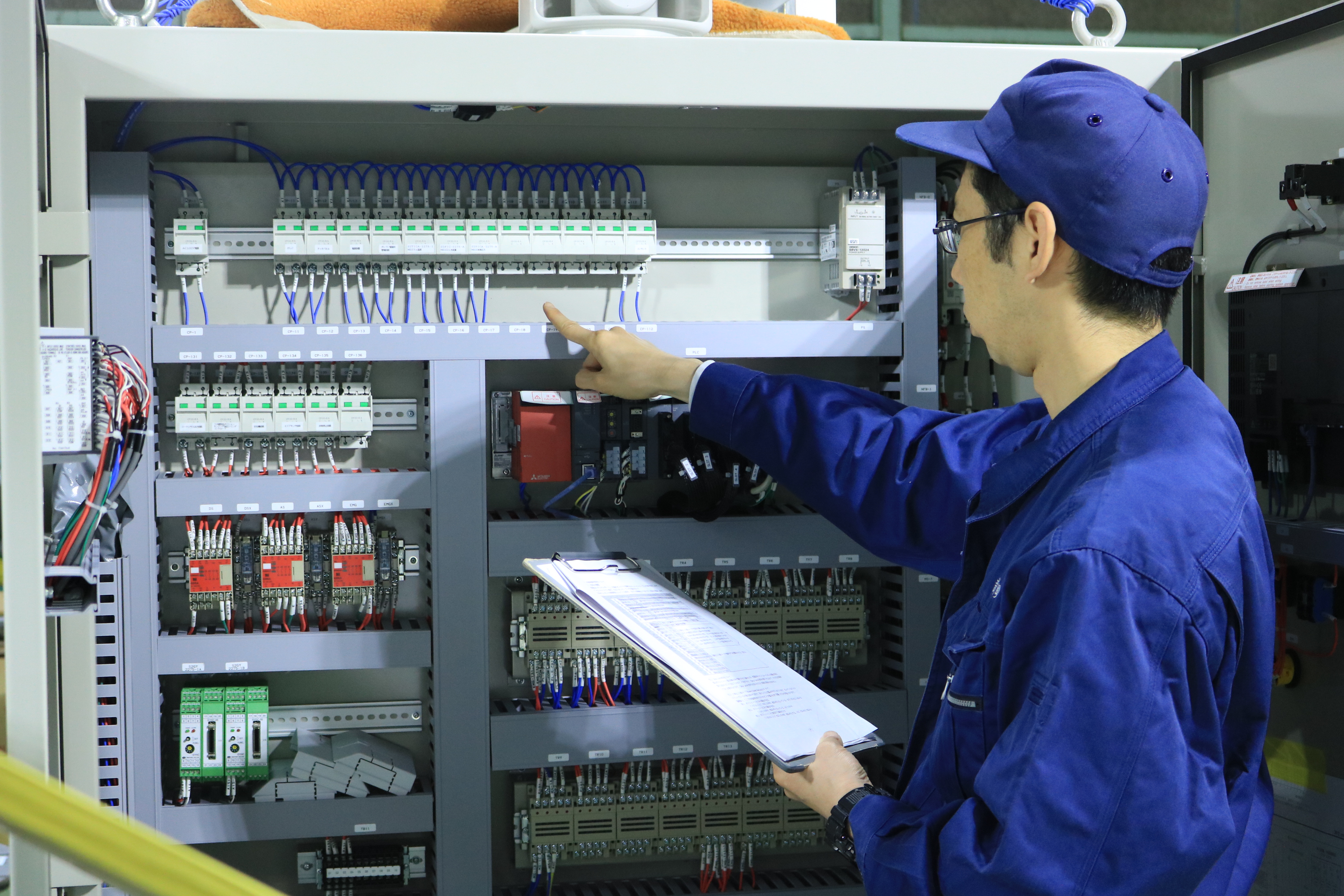 設計図面をもとに電線の選定及びパーツの取付、配管加工等を行い各種制御盤の組付けから配線・仕上げまでを行っております。
